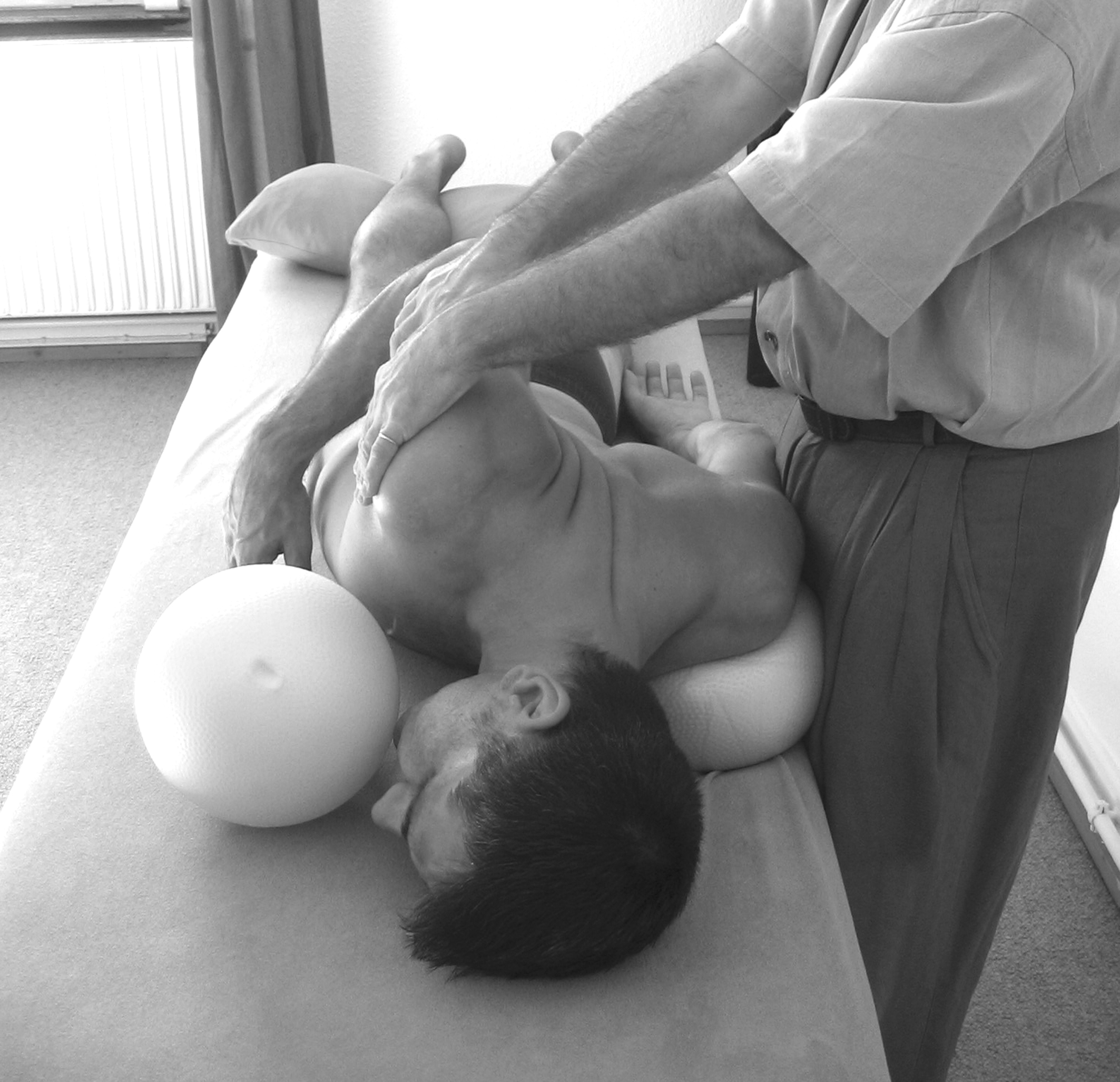 Entlastung der Brustwirbelsäule mit einer Ortho-Bionomy Positionierungstechnik mit Ball-Unterstützung. Die Zwischenschulterblatt Muskulatur wird entlastet, mit sanfter Kompression, und kann sich so entspannen.